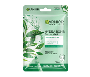 Perfect for oily and acne prone skin, the green tea extracts in the Garnier Hydra Bomb Green Tea sheet mask soothe and purify your skin and control excess oiliness.
